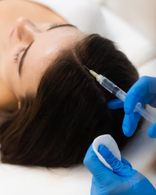 The PRP solution is carefully injected into areas of hair thinning using a fine micro-needle.